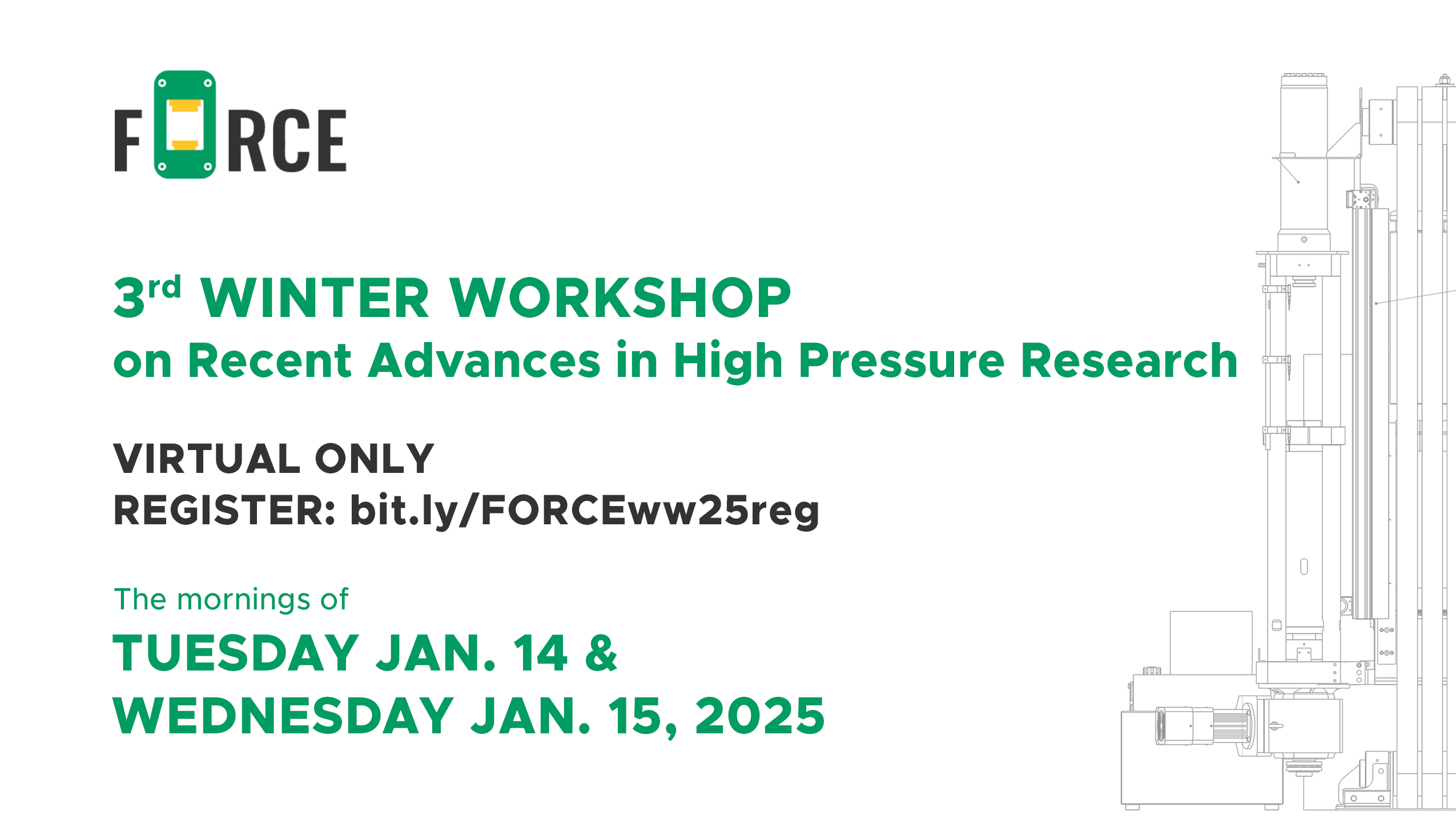 The FORCE 3rd Winter Workshop on Recent Advances in High Pressure Research will be held on Zoom the mornings of January 14 & 15, 2025.